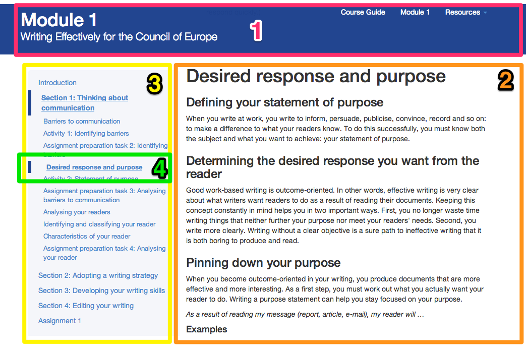 Writing Effectively for the Council of Europe is in modular format so that you can select those modules most relevant to your needs. Once you have successfully completed Module 1, you can choose to take either of the second-level modules. Both second-level modules will assume knowledge of the strategies, principles, and skills covered in Module 1. You will complete either Module 2A or Module 2B, but not both.